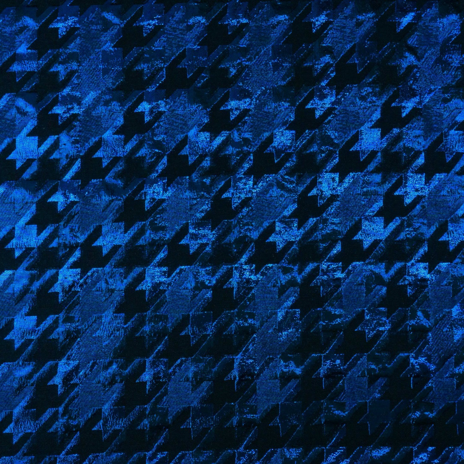Jacquardgewebe mit blau glänzenden Effektgarnen und Pepita Webmuster. Geeignet z.B. für Blousons, Kleider & Röcke.