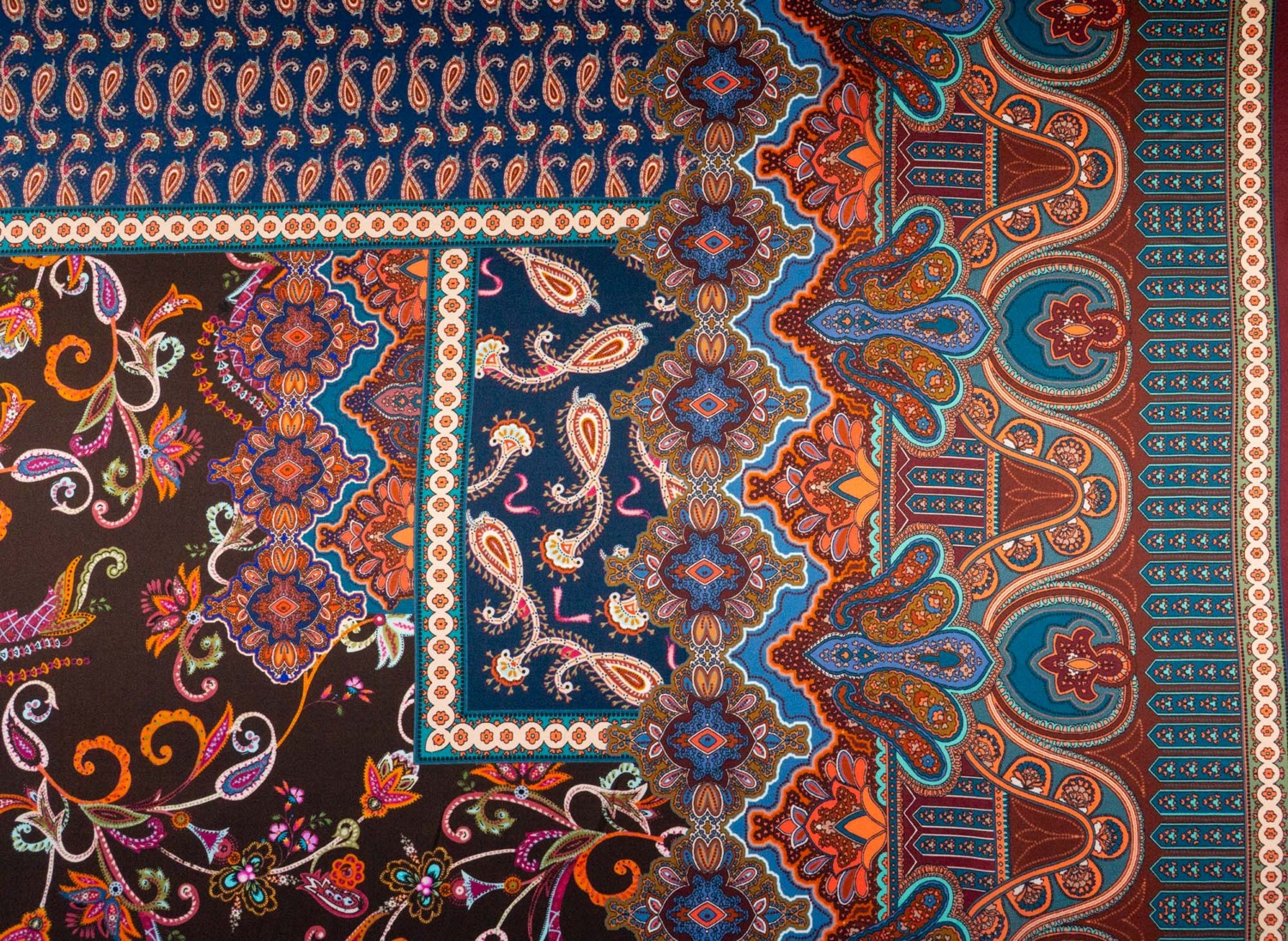 Seidenstoff, Satin, dunkelbraun, orange, türkis, dunkelrot, Paisley-Muster, Bordüre