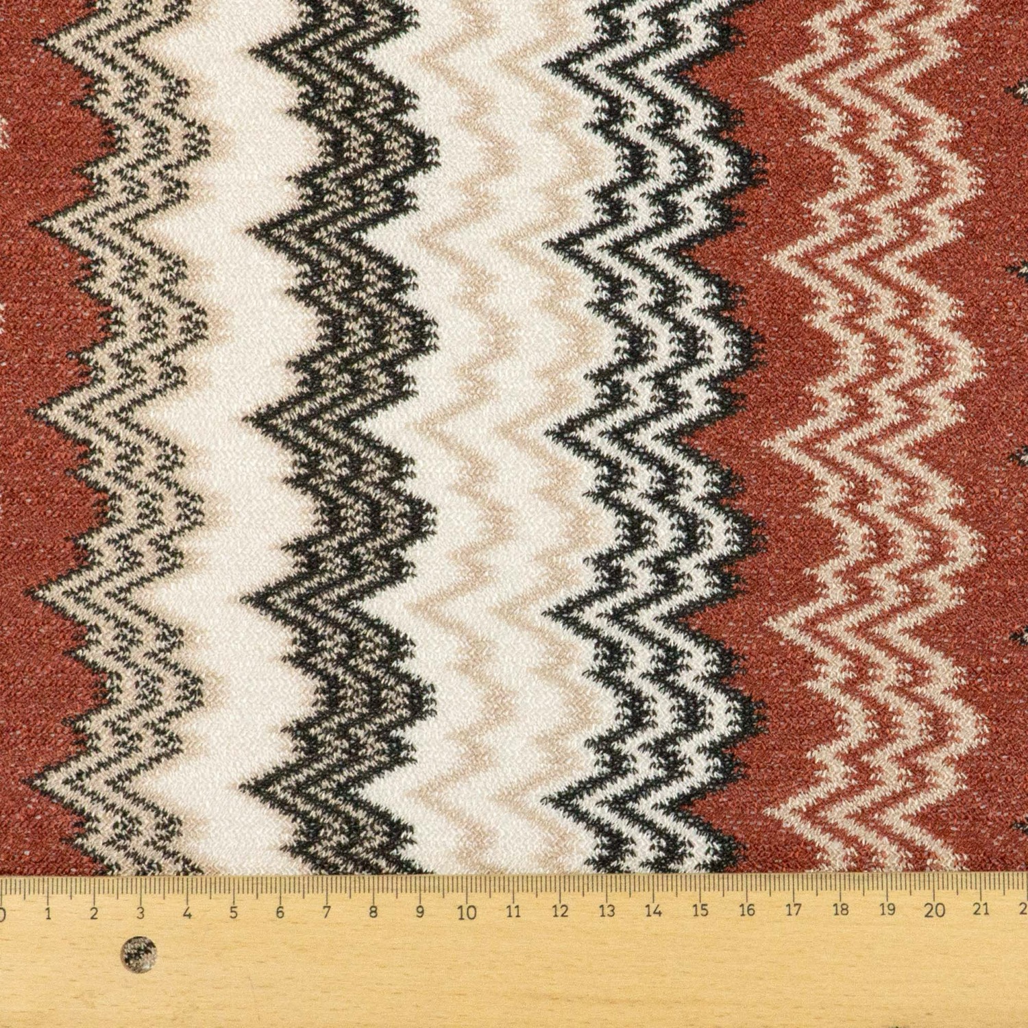 Strickstoff, rotbraun, creme, schwarz, Chevron-Muster