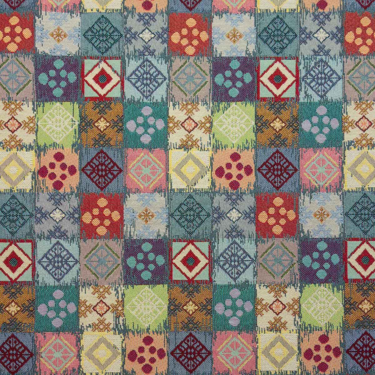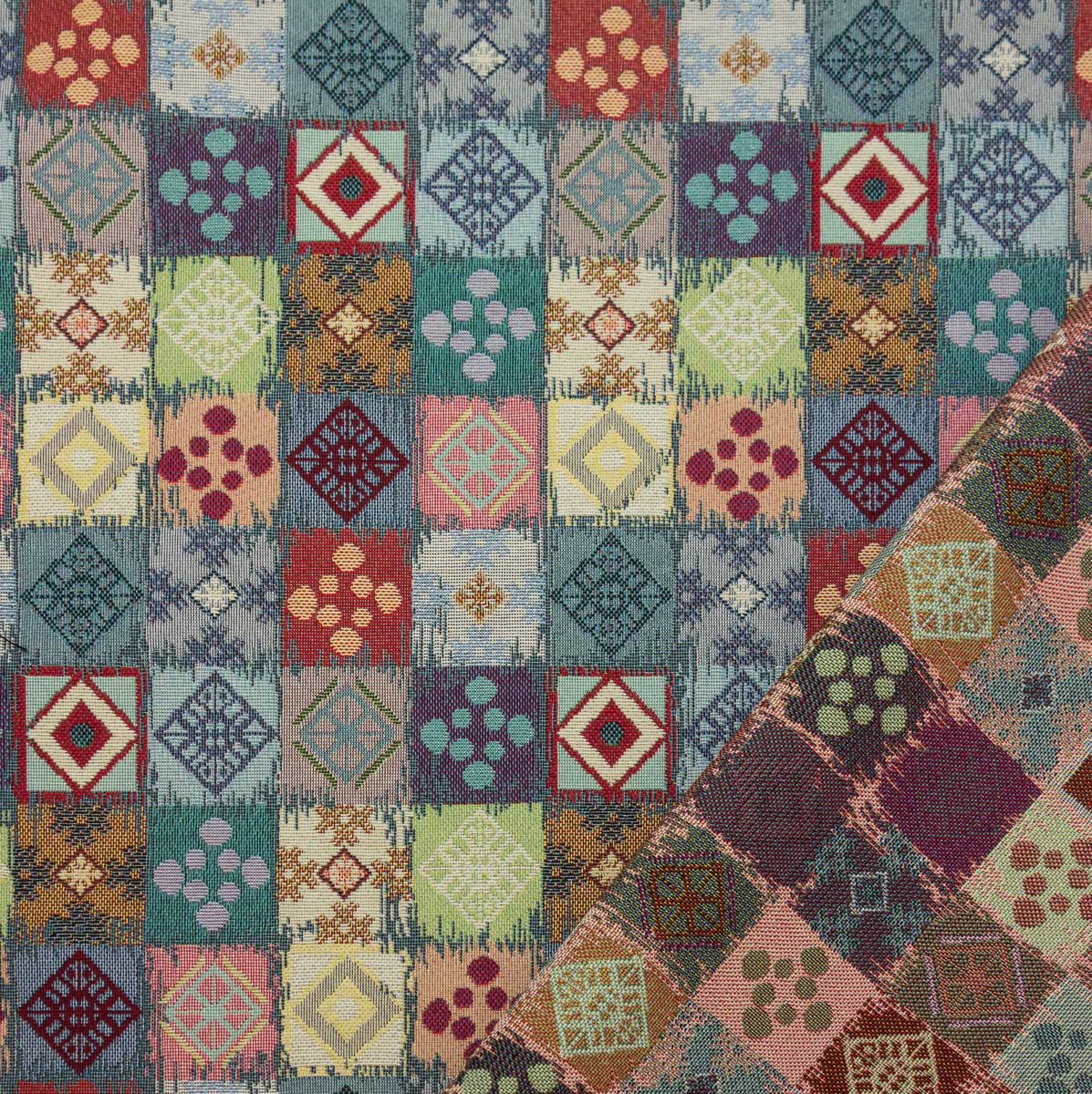 Robuster Gobelin mit eingewebten, geometrischen Mustern. Geeignet z.B. für leichte Polsterarbeiten, Wohnaccessoires und Taschen.