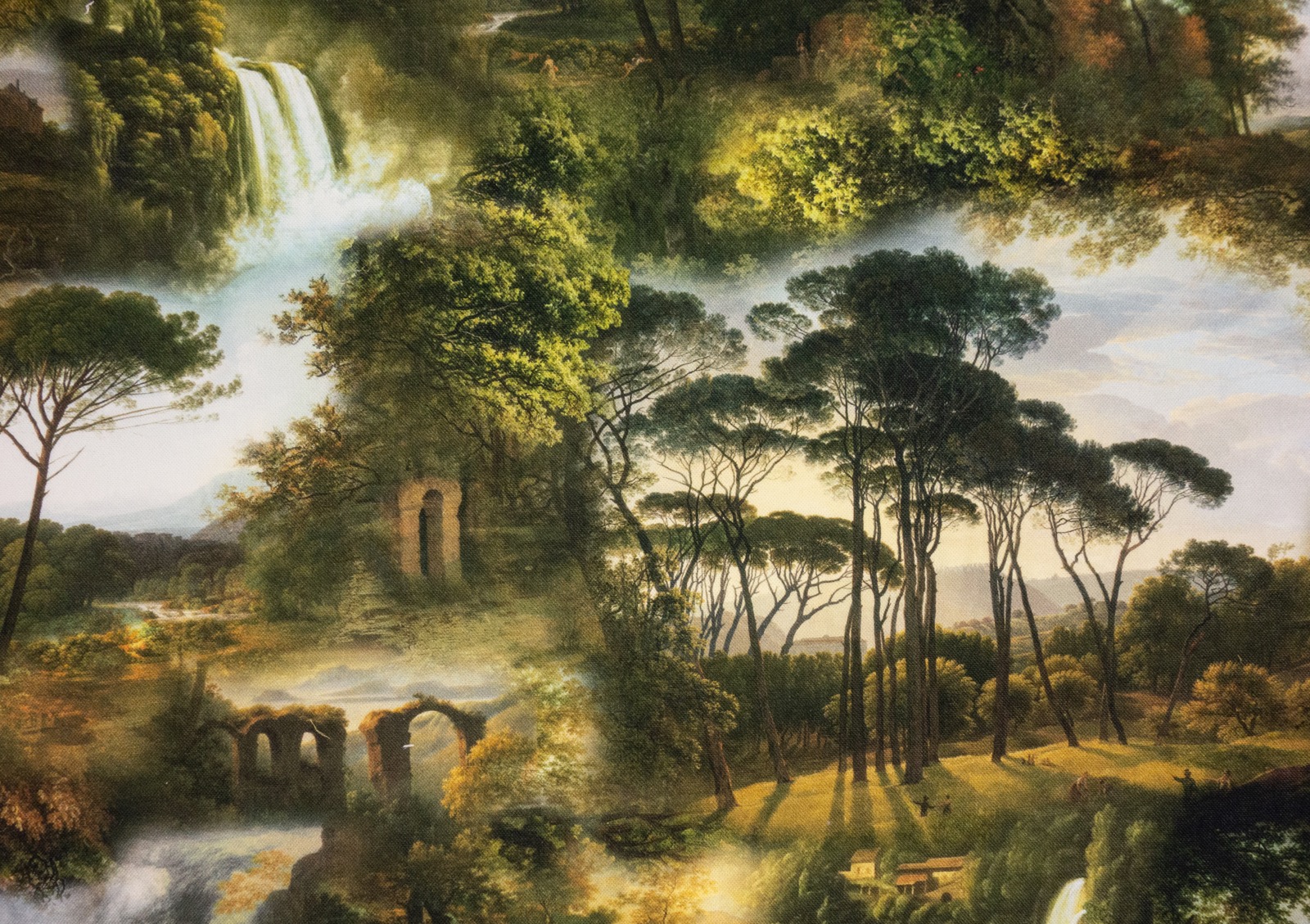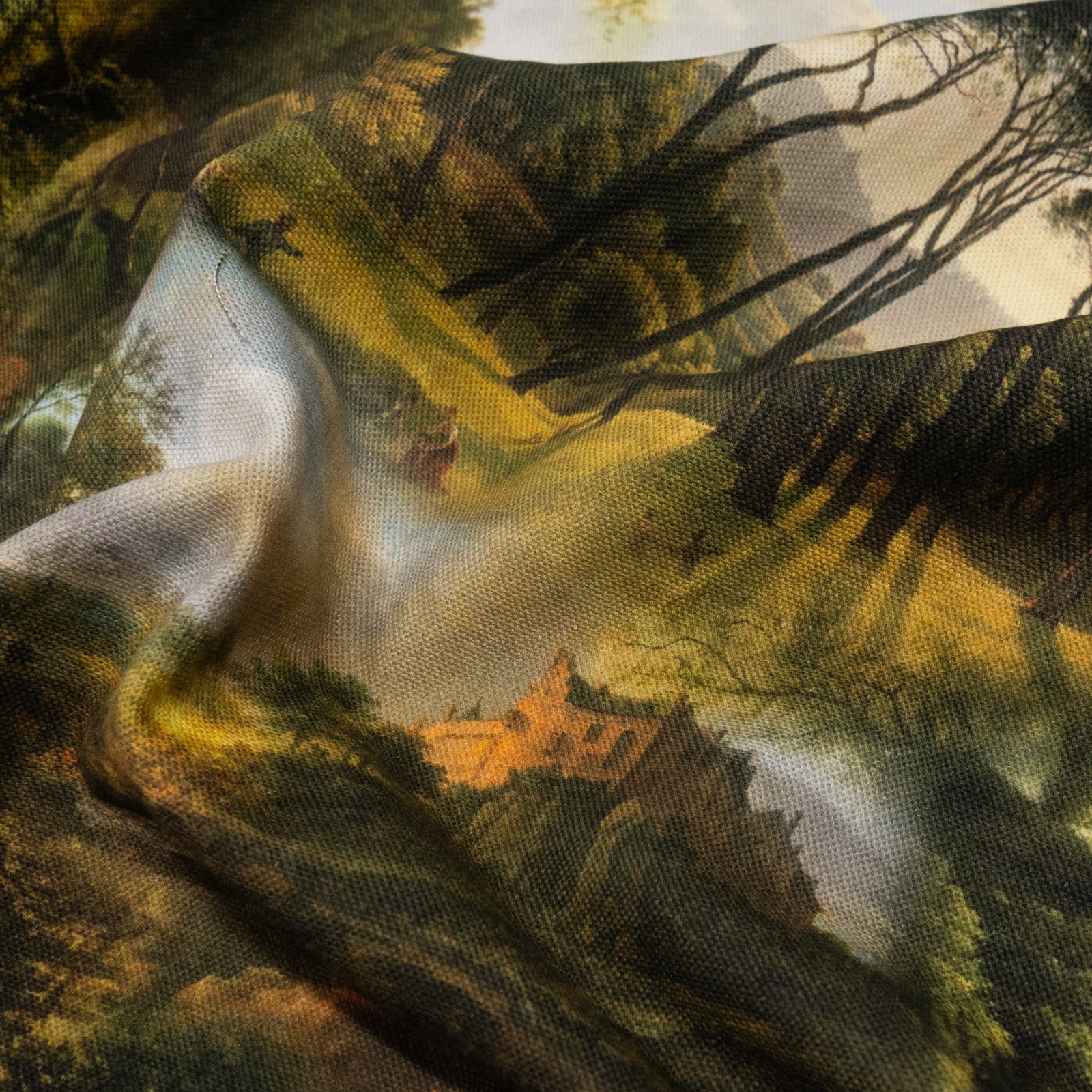 Dekostoff aus reiner Baumwolle mit einem Druckmotiv aus Wäldern und Aquädukten. Geeignet z.B. für Vorhänge, Kissen und Taschen.