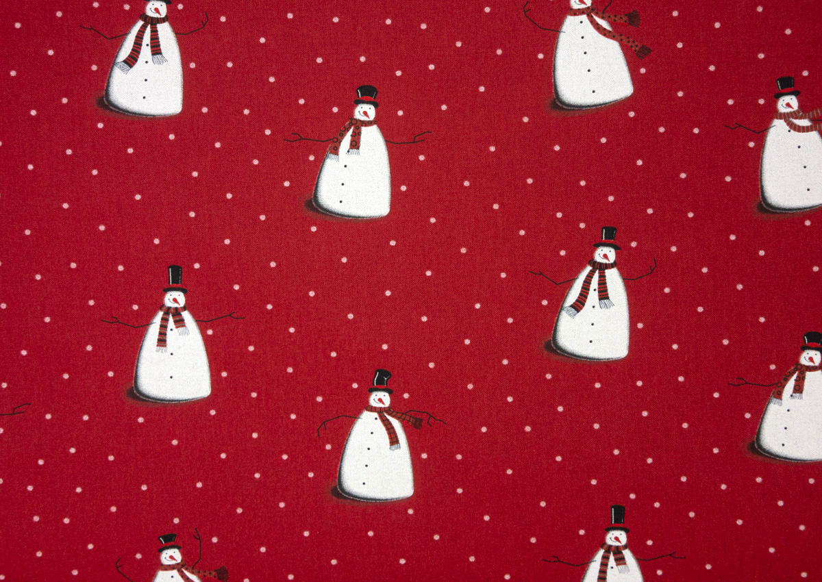 Leichter Dekostoff aus Baumwolle bedruckt mit Schneeflocken und Schneefiguren. Geeignet z.B. für Tischwäsche, Wohnaccessoires und Taschen.