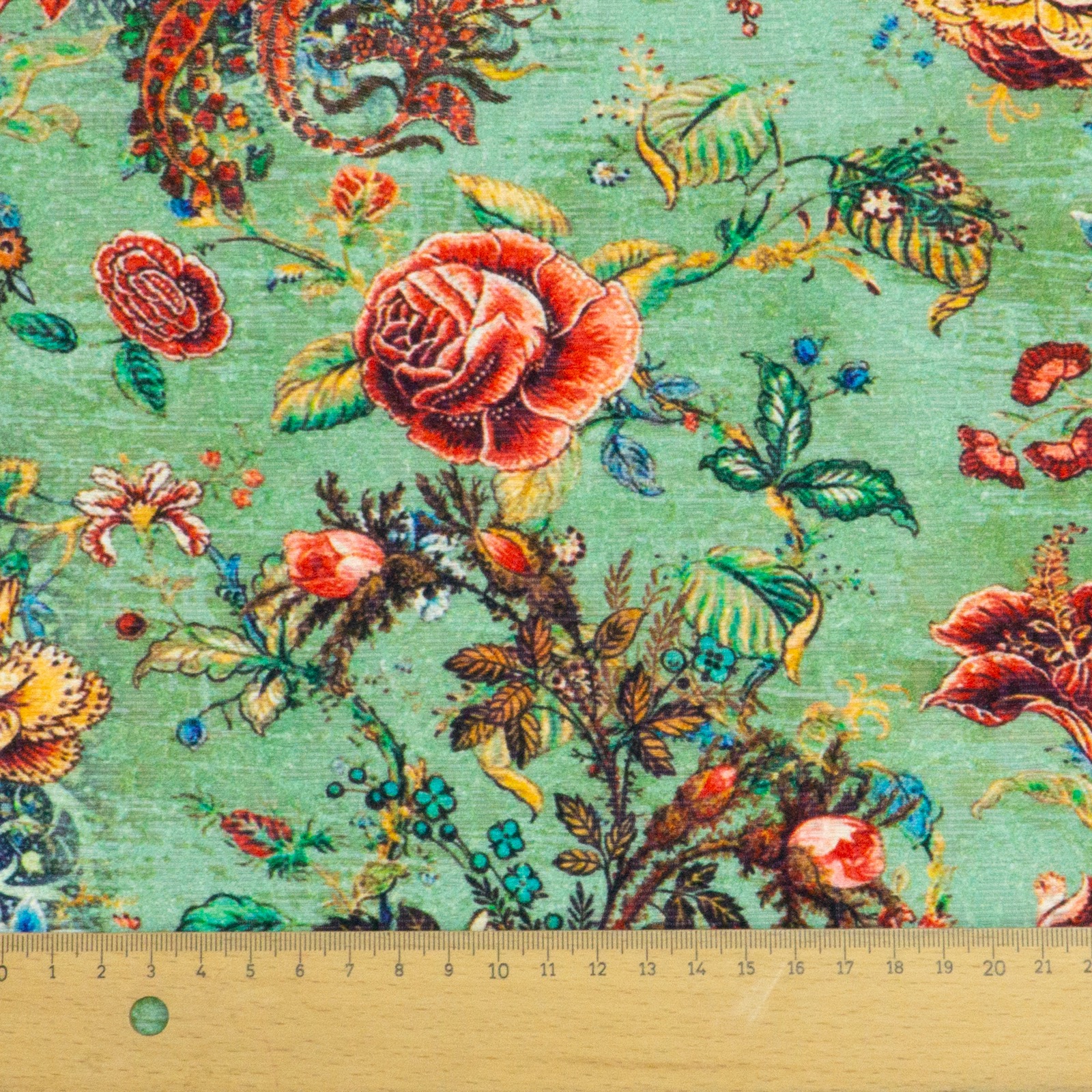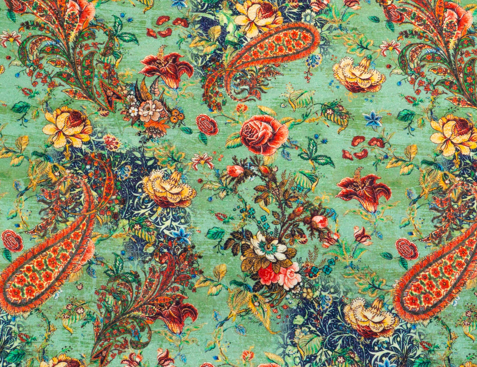 elastischer Jacquard, florale Motive, Paisley-Muster, Webstruktur, grüntöne, rottöne, orange