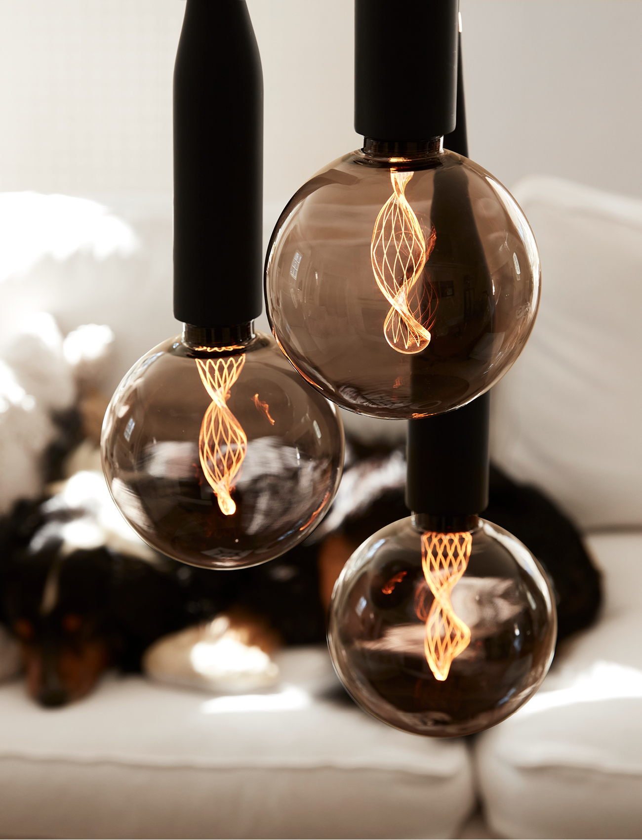 LED Curve leuchtet mit einer inneren, gedrehten Säule, die die Glühbirne beleuchtet. Die leuchtende Säule mit ihrem schönen Muster im Inneren des schwarz getönten Glases ist eine auffällige Lichtquelle.