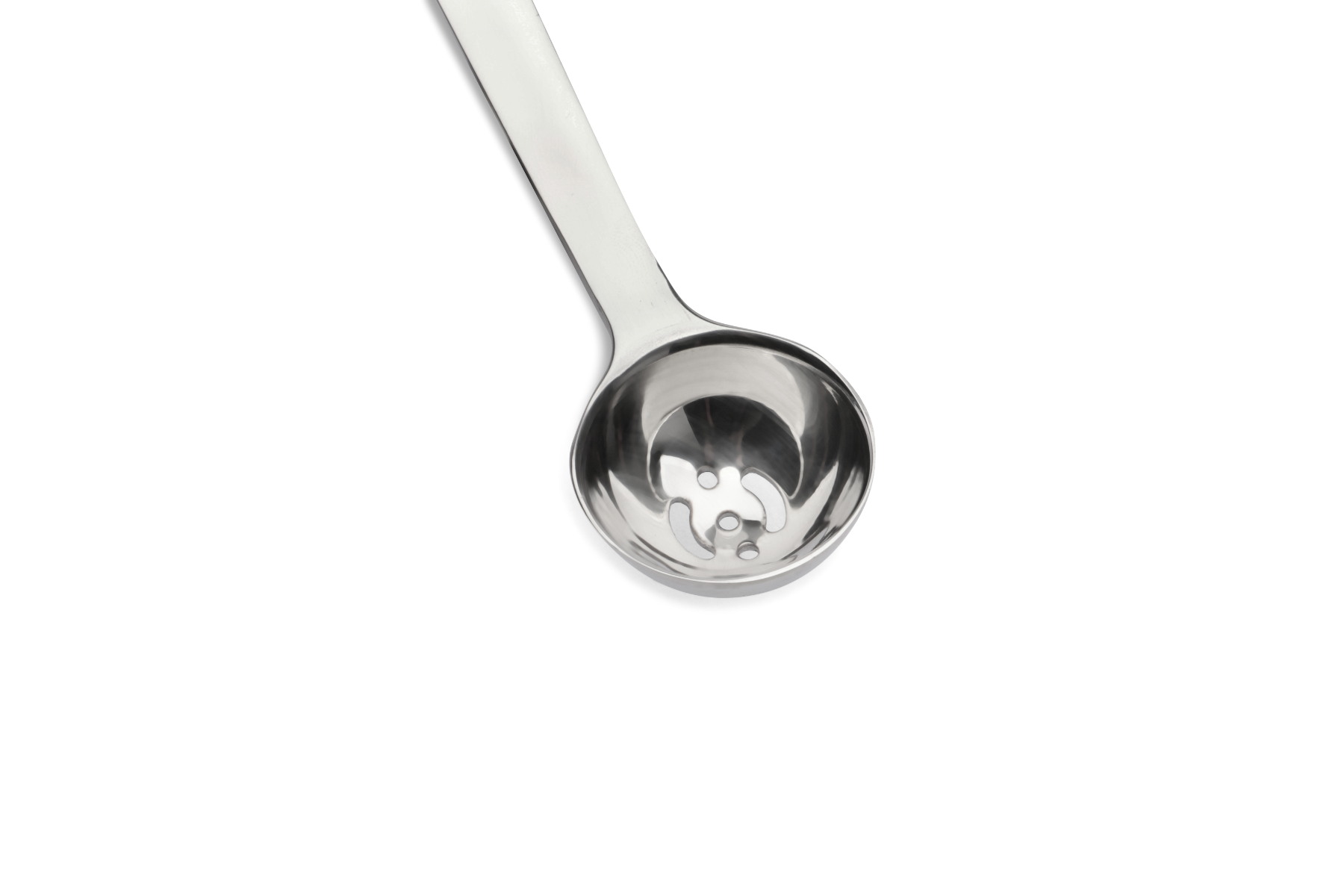 Der Löffel ermöglicht das gleichzeitige Entnehmen und Abtropfen von Oliven oder Sauerkirschen. Dank dem langen Stiel ist er auch bestens für tiefe Gläser geeignet.
