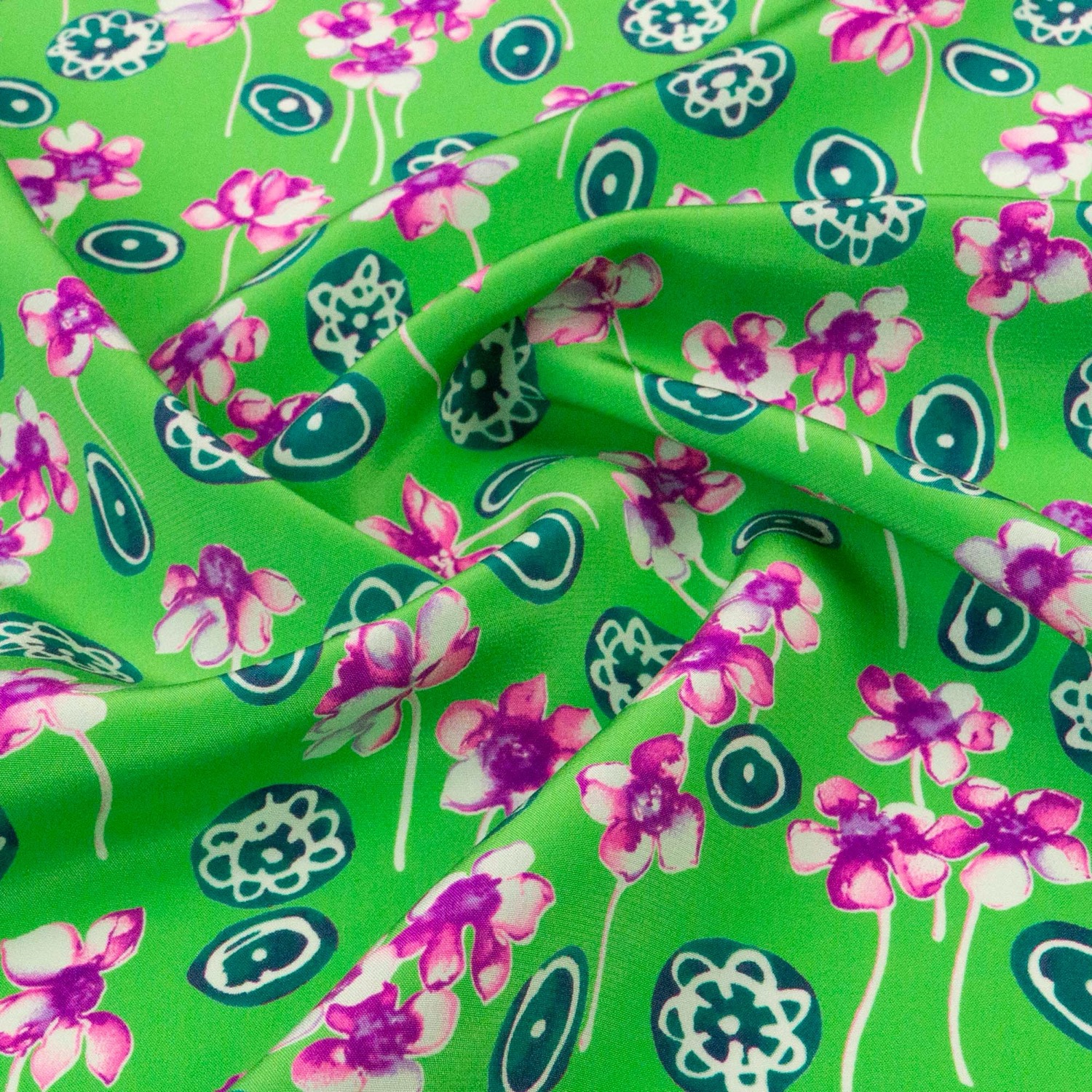 Seidenstoff, Crêpe, grün, pink, petrol, florale Motive