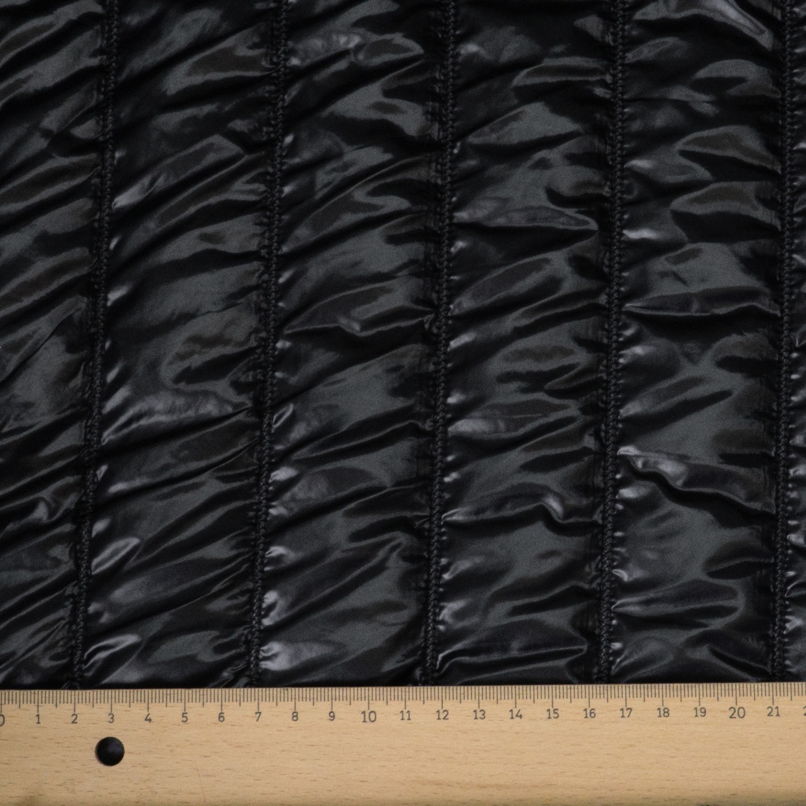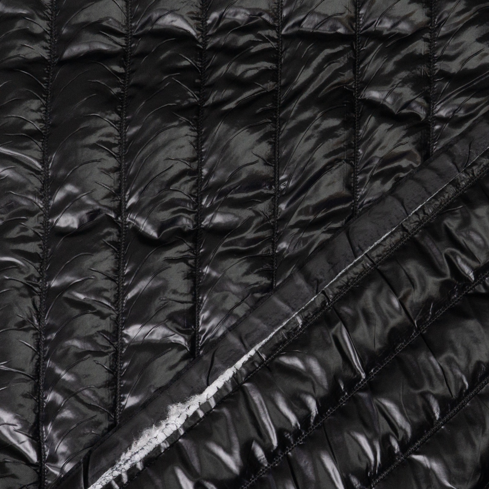 Dreilagiger Steppstoff mit ca. 5 cm breiten, abgesteppten Streifen – gefüllt mit weißem Volumenvließ und farblich passender Abseite. Geeignet z.B. für leichte Jacken und wattierte Taschen.
