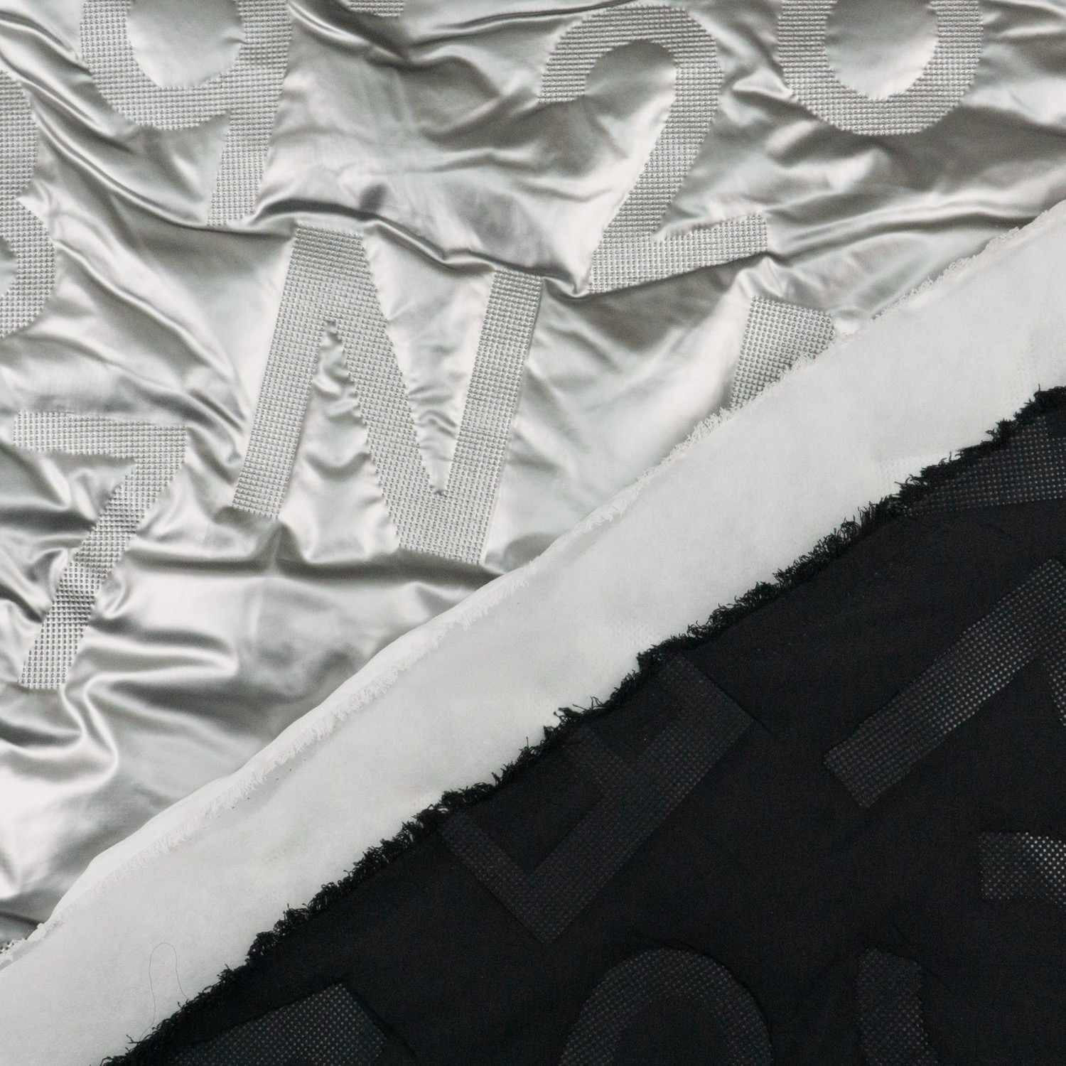 Dreilagiger Steppstoff mit eingeprägten Nummern und Buchstaben, seidenmattem Glanz und schwarzer Abseite. Geeignet z.B. für Jacken, Westen und Taschen.